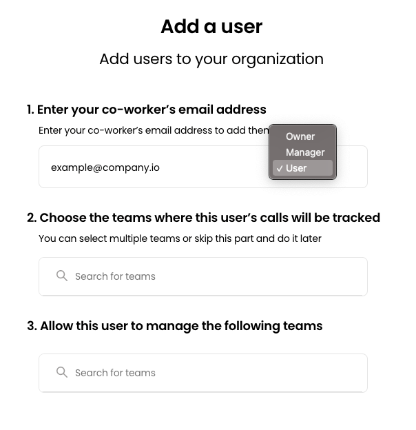 Step 3: Invite the people you want by their email addresses. Assign them an organisation role, to teams and manager role if needed.